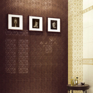 Декорация представлена витиеватыми бордюрами с помпезными изгибами, вставками, украшенными позолотой. Базовая плитка матовая - досконально и точно отображает поверхность декоративных элементов.