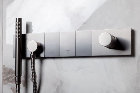 Внутренний механизм смешивания воды спрятан в стену. Снаружи остается аккуратная и стильная накладка.