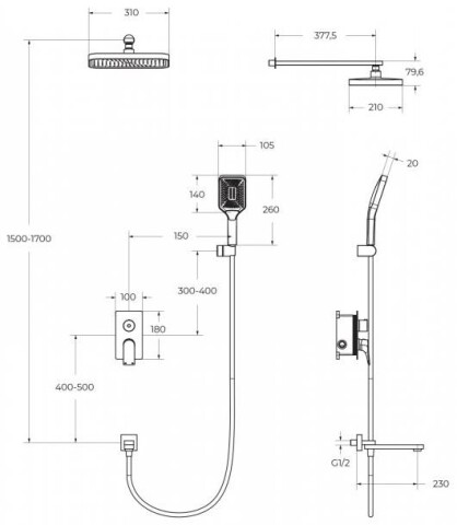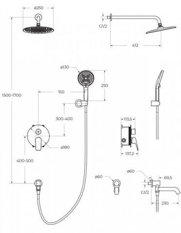 Дополнительная информация: регулируемая высота верхнего душа