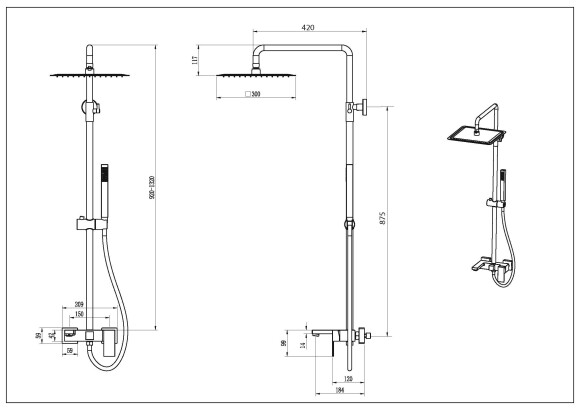 Состоит из: верхний душ, ручной душ, шланг для душа, держатель для душа, полочки, настенный вывод.