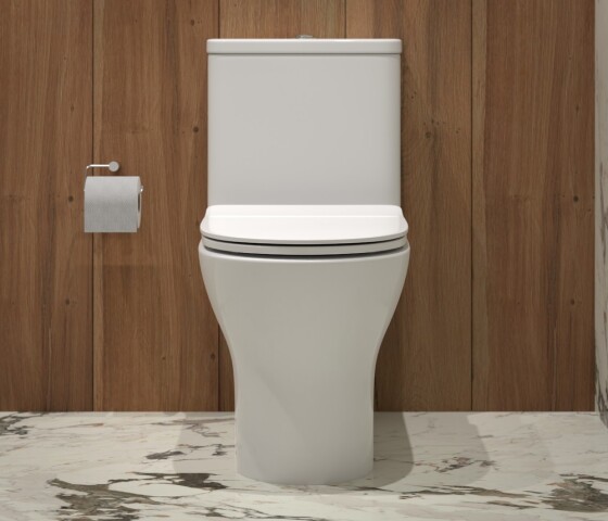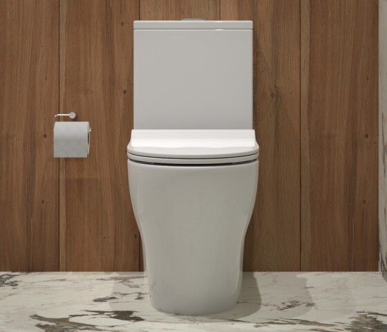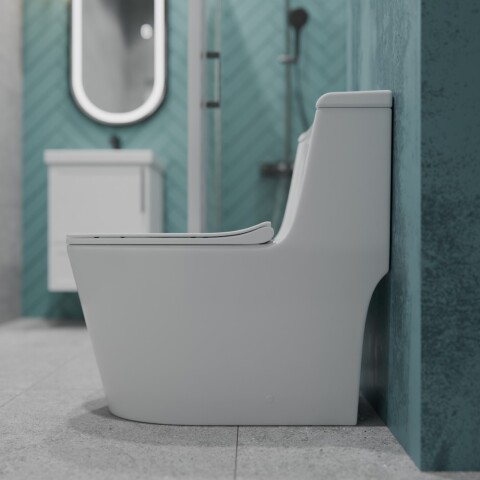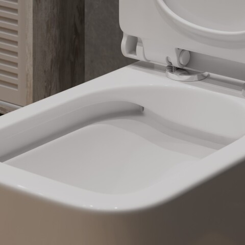 Устанавливается вплотную к стенке, коммуникации и бачок спрятаны в стене (или устанавливается под потолком)